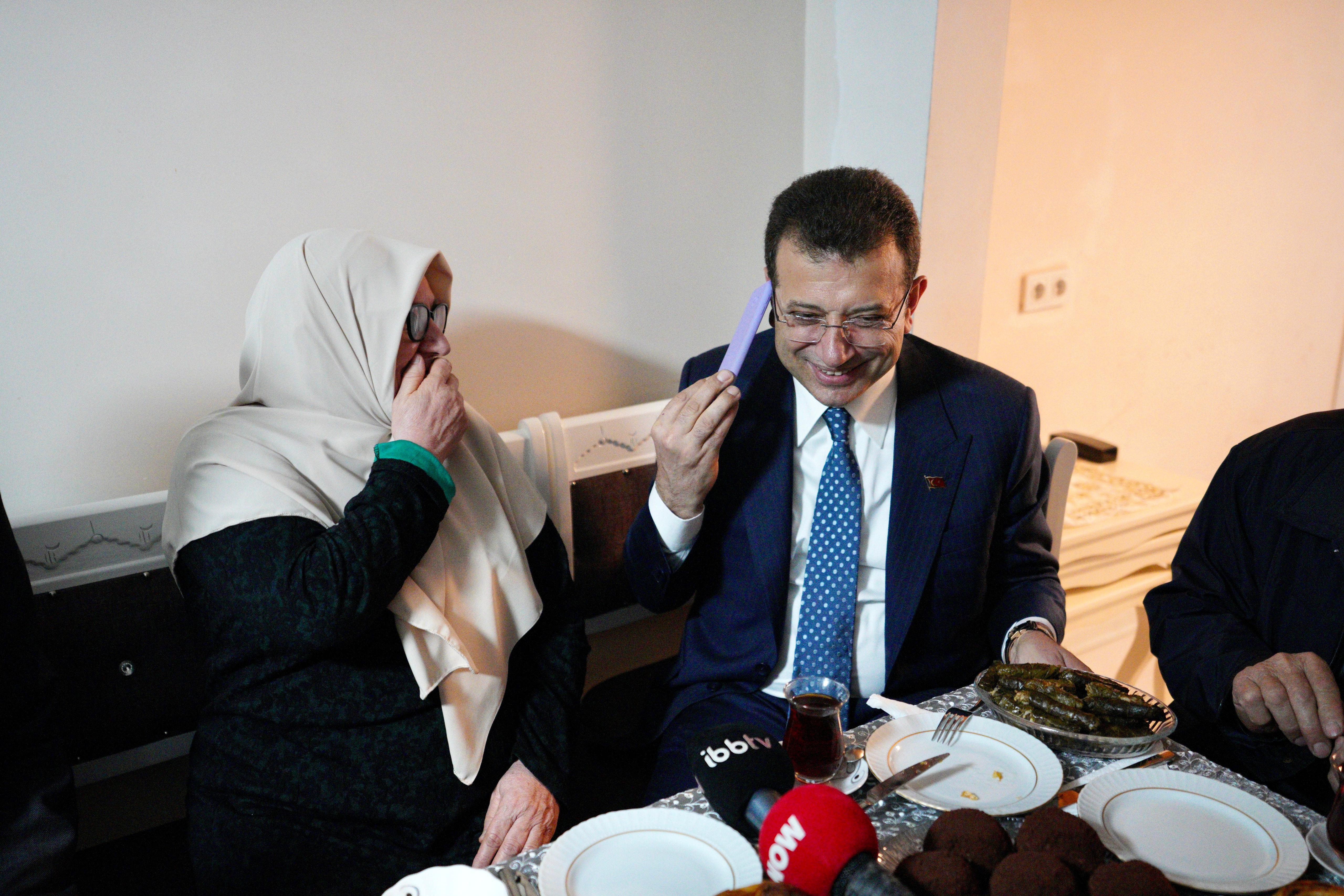 Telefonu alan İmamoğlu: Ellerinden öperim. Tanıştık annemle. Sağ ol anneciğim, sağ ol. Allah’ın izniyle Mahruze Abla’nın oyunu almaya geldik. Alıp gideceğiz. Yok yok, yine biz dua isteriz, başka bir şey istemeyiz.
