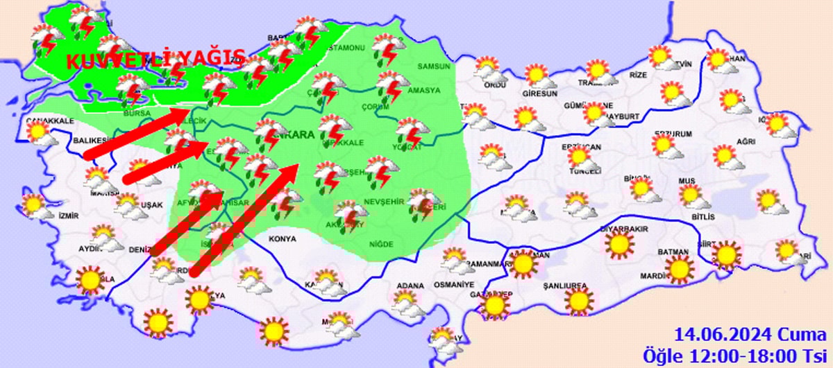 Yağışların; Marmara’nın kuzey ve doğusu ile Batı Karadeniz’de yerel kuvvetli olması beklenirken, güzgarın yarın öğle saatlerinden sonra İç Ege, Marmara’nın güneyi, Göller Yöresi ile Eskişehir çevrelerinde rüzgarın batı ve güneybatı yönlerden kuvvetli ve kısa süreli fırtına şeklinde (50-70 km/saat, kısa süreli 80 km/saat) esmesi tahmin ediliyor.